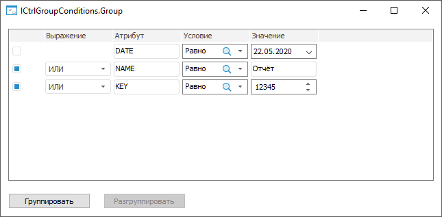 Группировка элементов доступна, если в компоненте последовательно отмечены хотя бы два элемента, которые не содержатся в других группах. Для определения массива отмеченных элементов используйте свойство ICtrlGroupConditions.SelectedRows.