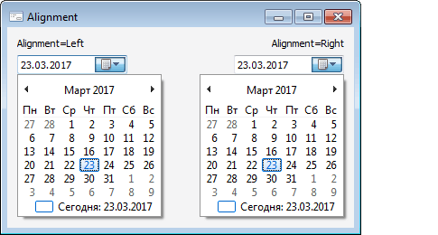 Свойство Alignment определяет способ выравнивание раскрывающегося календаря относительно границ компонента.