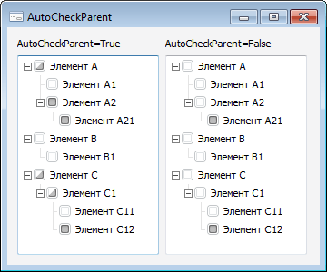 Свойство AutoCheckParent определяет, будет ли у родительских вершин компонента автоматически устанавливаться неопределенное состояние (CheckState = Indeterminate), если отмечены не все дочерние вершины.
