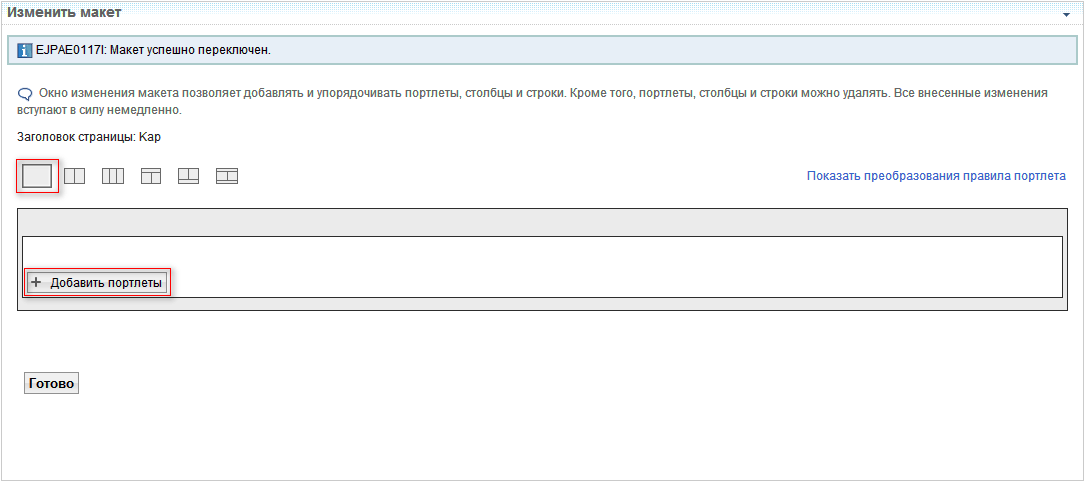 Откроется окно «Изменить макет». Выберите макет «Один столбец» и нажмите на кнопку «Добавить портлеты»: