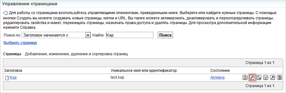 В открывшемся списке страниц найдите созданную страницу, для этого можно использовать строку поиска.