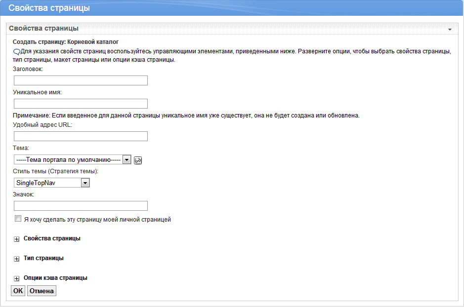 Перейдите в раздел «Пользовательский интерфейс портала» > «Управление страницами». В списке страниц выберите «Корневой каталог», нажмите на кнопку «Создать страницу». Откроется окно «Свойства страницы»: