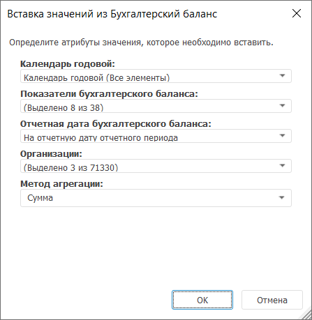 Измерения источника данных. Задайте отметку элементов, по которой будет вычисляться выражение, выбрав элементы из раскрывающихся списков. Для работы с отметкой элементов измерения используйте команды контекстного меню, описанные в статье «Изменение отметки в справочниках»;