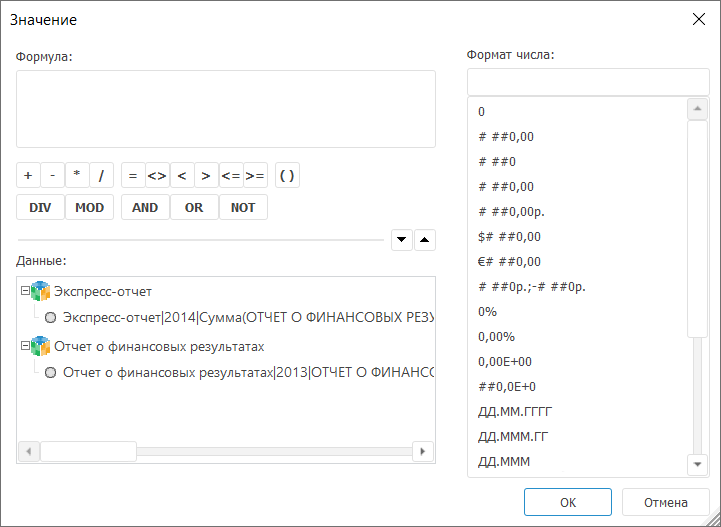 Формула. Предназначена для формирования формулы для расчёта выражения. В формуле допускается использование любых арифметических операций, цифр, знаков сравнения и круглых скобок. Формировать выражение можно набором с клавиатуры, используя область данных и соответствующие кнопки операторов.