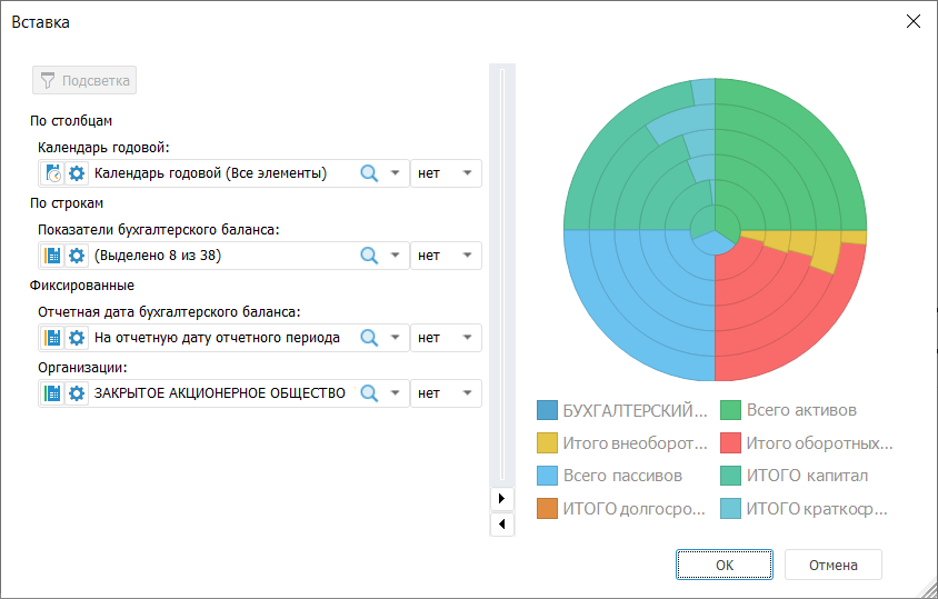 После выбора источника данных отобразится окно «Вставка»: