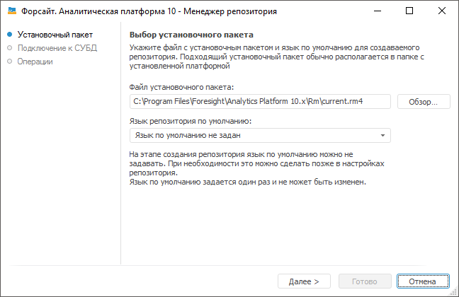 1. Файл установочного пакета. Для создания нового репозитория автоматически будет выбран путь к файлу с расширением *.rm4, в котором хранятся исполняемые скрипты. Данный файл входит в стандартный установочный пакет и находится по пути «S\Rm\current.rm4», где S - путь до места установки «Форсайт. Аналитическая платформа».