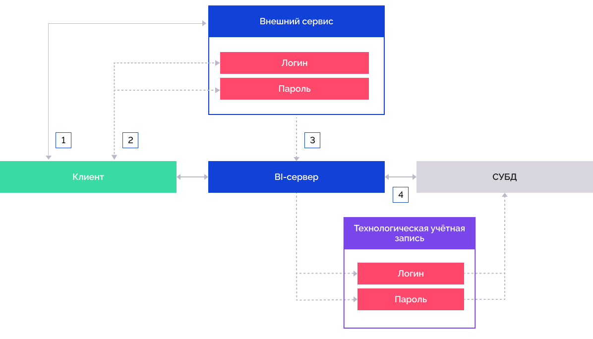 2. BI-сервер обращается к СУБД, используя заранее введённые имя пользователя и пароль гостевой учётной записи.