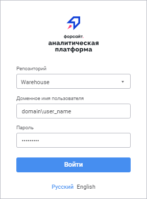 1. Пользователь вводит доменное имя пользователя в формате «домен\имя» и пароль в окне регистрации «Форсайт. Аналитическая платформа»: