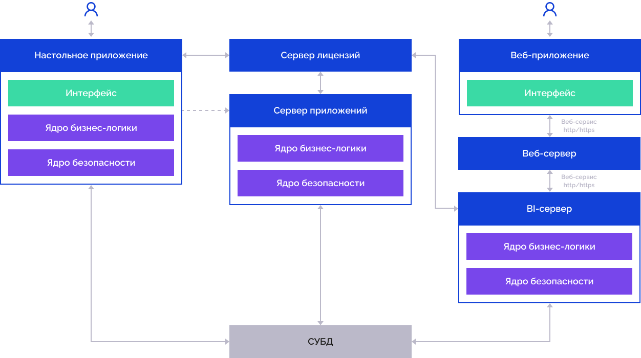 При использовании веб-приложения функции бизнес-логики и безопасности выполняет BI-сервер, пользовательский интерфейс представлен веб-приложением: