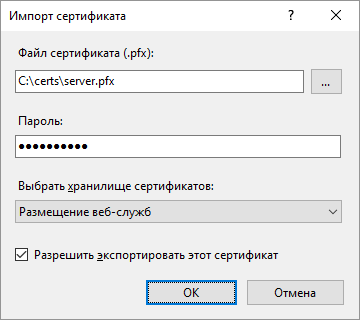 Файл сертификата (.pfx). Укажите путь до сертификата сервера server.pfx;