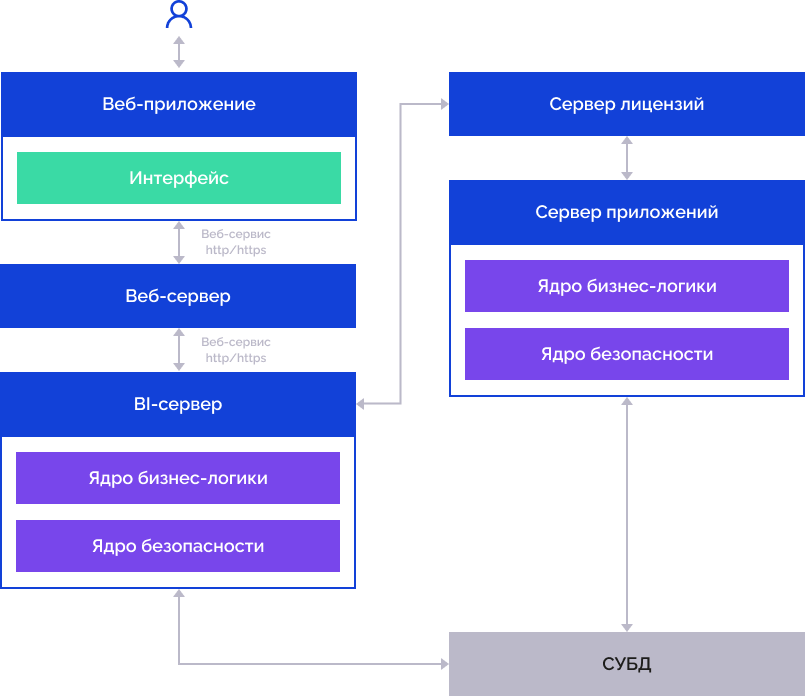 Примечание. BI-сервер, сервер приложений и веб-приложение могут располагаться на одном физическом сервере. При выполнении ресурсоёмких задач располагайте сервер приложений и BI-сервер на различных физических серверах.