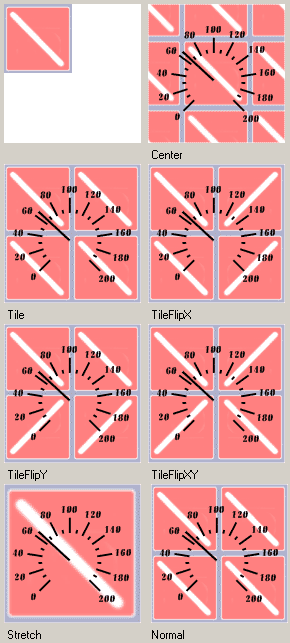 | 3 | TileFlipX. Расположить картинку в верхнем левом углу. Если размер картинки меньше чем область спидометра, то картинка будет размножена на всю область, при этом картинки, размноженные по оси X будут чередоваться - прямая/зеркальная. |