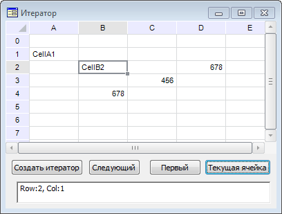 Перейдите на следующий элемент итератора при помощи кнопки «Button2», которая была создана в примере для ITabCellIterator.Next. Нажмите кнопку «Button4»: значение ячейки изменится на «Cell <адрес ячейки>», в компоненте EditBox будет выведен текст «Row:-<индекс строки>, Col: <индекс столбца>»: