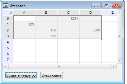 При нажатии на кнопку «Button1» (в нашем примере это кнопка с текстом «Создать итератор») для выделенного диапазона таблицы будет создан итератор и определен порядок перехода по ячейкам таблицы - «По столбцам».