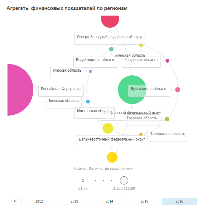 Для визуализатора «Пузырьковое дерево» доступны все операции с объектами, приведенные в разделах «Построение аналитической панели» и «Вставка и настройка визуализаторов».