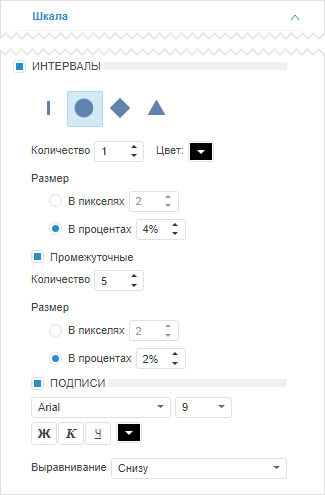 Промежуточные. Параметры промежуточных делений шкалы. Для отображения промежуточных делений установите флажок и задайте количество, цвет и размер делений;