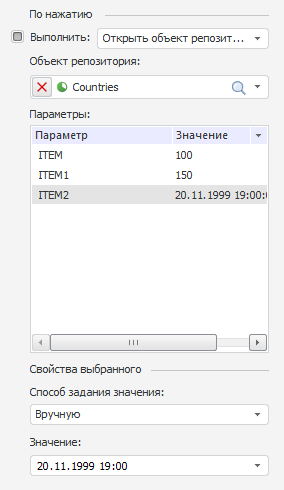 Примечание. При нажатии на элемент измерения, для которого настроено открытие объекта с параметрами, должен открываться объект с учетом заданных значений параметров.