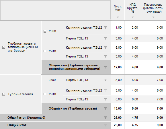 Пример отображения агрегированных данных из источника, промежуточных итогов и общего итога: