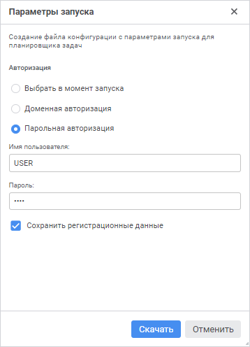 Авторизация. Если в конфигурационном файле планировщика задач задано значение параметра <Credentials Authentication="0"/>, то при запуске планировщика задач будет открыт диалог «Авторизация в БД» для определения типа авторизации: