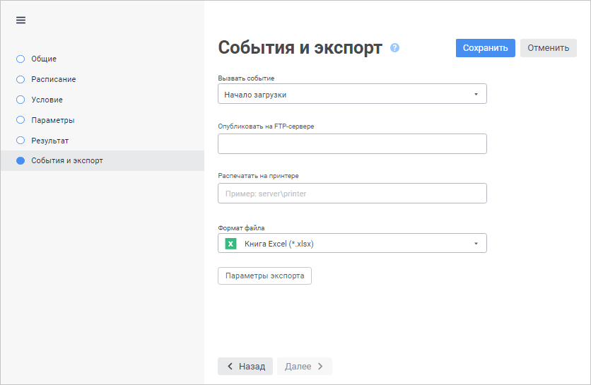Примечание. Для отчёта, отправляемого по электронной почте и/или публикуемого на FTP-сервере, доступны следующие форматы: XLSX, XLS, PDF, PNG в веб-приложении; XLSX, XLS, PDF, RTF, HTM, ODS, EMF, PPREPORT в настольном приложении.