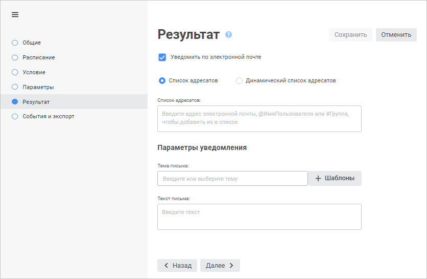 Для настройки вариантов обработки результата выполнения задачи используйте страницу/вкладку «Результат» в мастере настройки задачи.