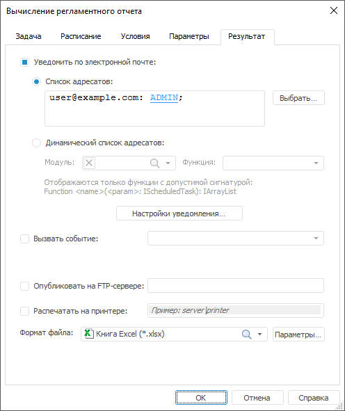 Для задачи вычисления регламентного отчёта доступны дополнительные варианты обработки результата: