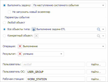 При выборе варианта «По наступлению системного события» задача будет выполняться при наступлении определенного системного события. На странице/вкладке «Расписание» будет доступна настройка параметров системного события: