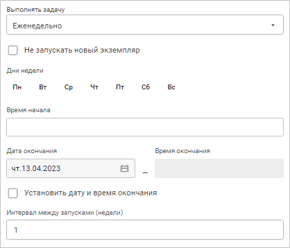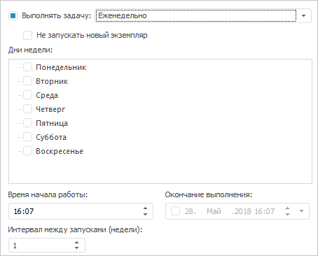 Интервал между запусками. Задаёт количество недель, через которое будет производиться запуск задачи на выполнение.