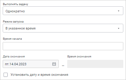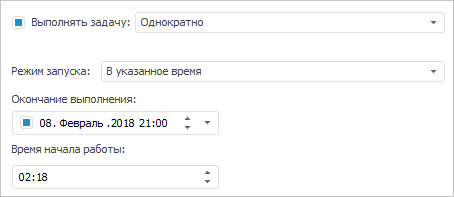 После выполнения действий задача будет запущена на выполнение однократно по выбранному режиму запуска и закончит выполнение в выбранное время, если оно задано.