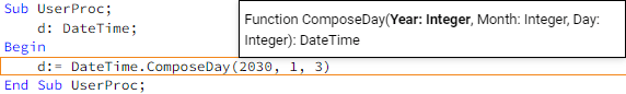 Для любого члена типа реализована всплывающая подсказка, содержащая синтаксис члена и список всех его обязательных и необязательных параметров. Данная подсказка выводится автоматически после указания открывающей круглой скобки после наименования члена типа. Параметр, значение которого редактируется в текущий момент, подсвечивается жирным шрифтом. После указания закрывающей круглой скобки всплывающая подсказка будет скрыта. Для вызова подсказки вручную используется сочетание клавиш CTRL+SHIFT+ПРОБЕЛ.