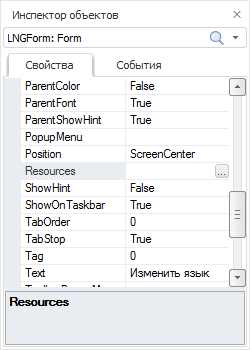 После подключения ресурсов к форме для всех визуальных компонентов в инспекторе объектов к свойствам, имеющим строковый тип данных, будет добавлен дополнительный атрибут «ResourcesID». Данный атрибут соотносит значения строковых элементов ресурсов с значениями свойств строкового типа для визуальных компонентов. Значение атрибута формируется автоматически и состоит из имени компонента, содержащего объект, имени объекта и имени свойства, разделенных точками.