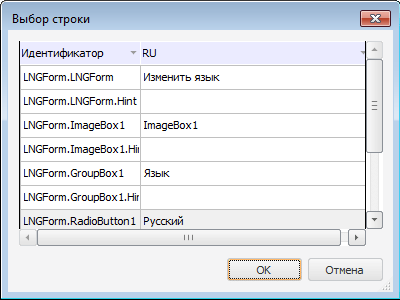 Диалог содержит все строковые элементы ресурсов, подключенных к форме. Для каждого элемента ресурсов отображаются идентификатор и значение для языка по умолчанию. После выбора нового строкового элемента нажмите кнопку «ОК».