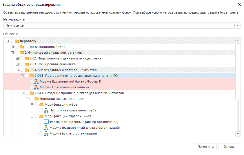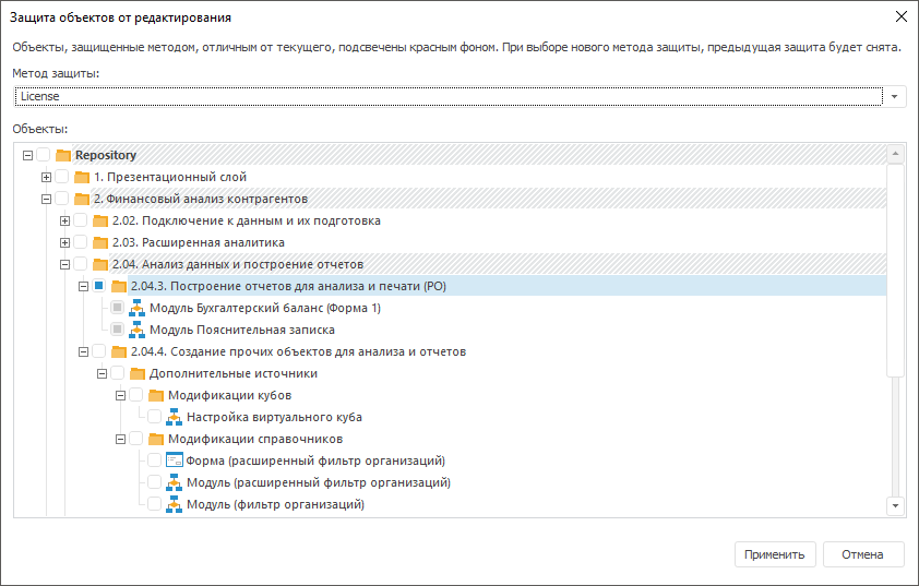 В настольном приложении объекты репозитория могут быть защищены от редактирования с помощью прикладной единицы лицензирования, которая не входит в набор стандартных единиц лицензирования продукта «Форсайт. Аналитическая платформа», а заказывается и генерируется отдельно. В дальнейшем полученная прикладная единица лицензирования не передается заказчикам.