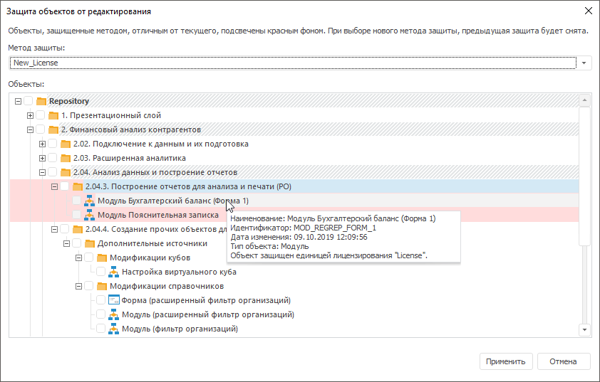 Для просмотра прикладной единицы лицензирования, с помощью которой защищен объект, в окне «Защита объектов от редактирования» доступна всплывающая подсказка: