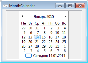 Компонент MonthCalendar реализует развернутый календарь, позволяющий редактировать значение даты. В календаре поддерживаются даты в диапазоне 01.01.1601-31.12.9999.