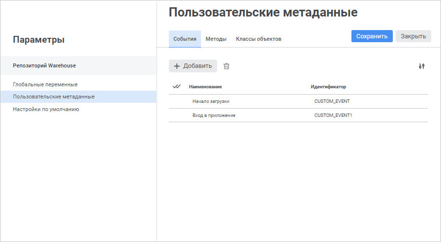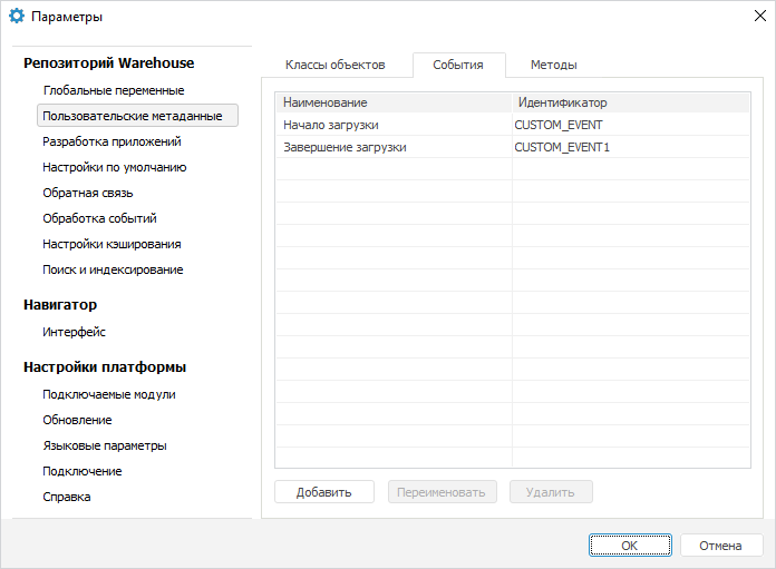 Список настраиваемых событий задаётся на вкладке «Пользовательские метаданные > События» в окне «Параметры».