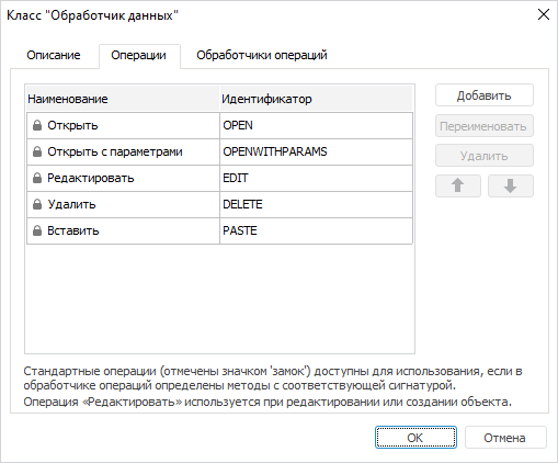 Для настройки операций, которые будут доступны для объектов пользовательского класса, используйте вкладку «Операции» в окне «Класс <наименование класса>».