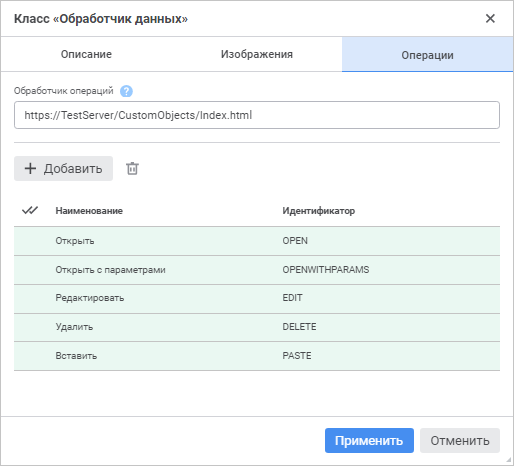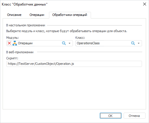 Для задания обработчика операций из веб-приложения в поле «Скрипт» укажите URL-адрес скрипта (js-файла или html-страницы, содержащей скрипт), реализующего операции, например, https://TestServer/CustomObjects/Index.html или https://TestServer/CustomObjects/Operations.js.