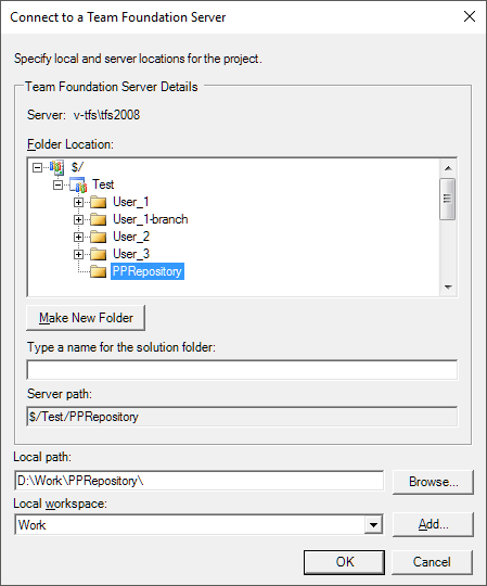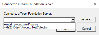 При выборе провайдера Team Foundation Server будет выдан диалог для выбора сервера: