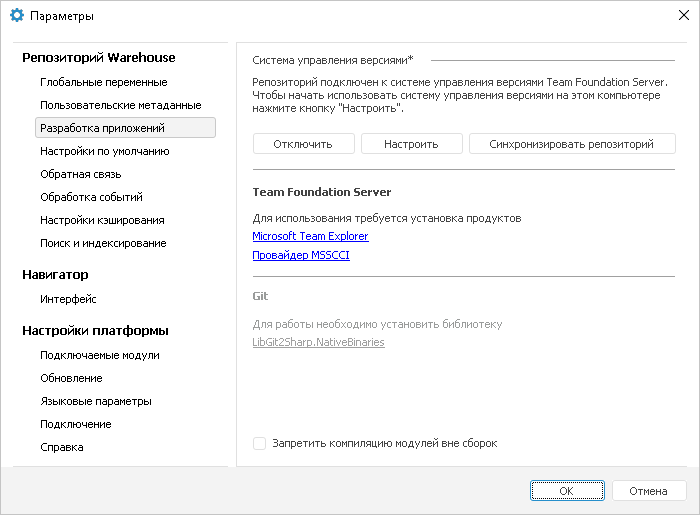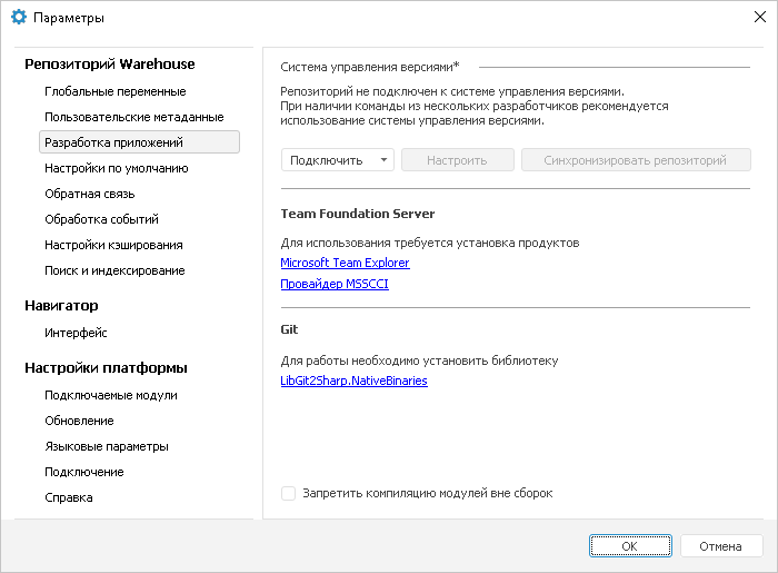 Примечание. Пользователи, компьютеры которых не были настроены на работу с системой управления версиями, будут использовать версии объектов, хранящихся в репозитории. При этом вкладка «Разработка приложений» в окне «Параметры» будет принимать вид аналогично виду вкладки после подключения репозитория к системе управления версиями.