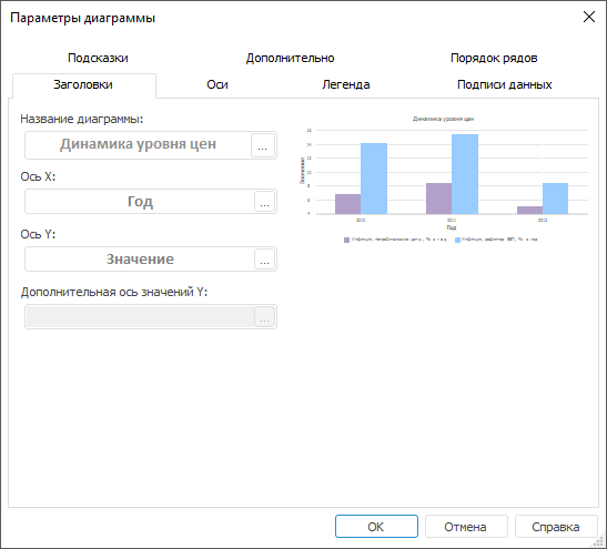 Параметры заголовков диаграммы и осей можно настроить на вкладке «Заголовки» окна «Параметры диаграммы».
