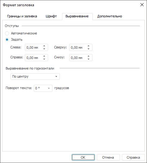 Для настройки выравнивания заголовка перейдите на вкладку «Выравнивание» окна «Формат заголовка». Настройка доступна в настольном приложении.