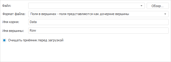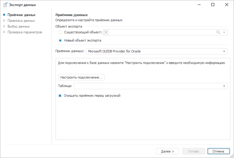 На странице «Приёмник данных» выберите приёмник данных и укажите его параметры: