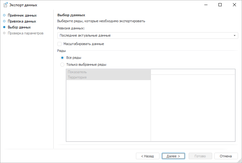 Только выбранные ряды. Набор экспортируемых рядов ограничивается: выгружаются только ряды с определенными значениями атрибутов. Укажите значения для требуемых атрибутов. Если значение атрибута не задано, то экспортированы будут ряды со всеми значениями данного атрибута.