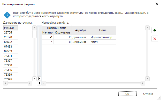 Настройка формата атрибутов выполняется с помощью диалога «Расширенный формат» и определяет параметры разбора составного атрибута, использованного в источнике данных.
