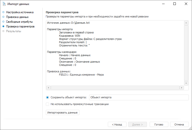 Страница «Проверка параметров» отображает заданные настройки и предназначена для выполнения импорта данных.