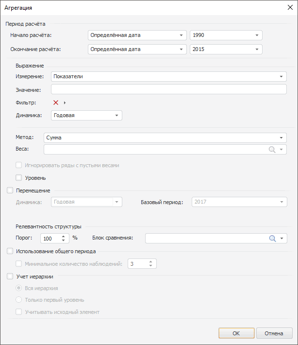 После применения метода будет отображен диалог «Агрегация», предназначенный для настройки параметров расчёта. Например: