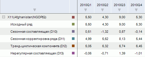 После применения метода в рабочей книге на основе каждого выделенного ряда будет создан вычисляемый ряд с наименованием вида «X11(<Имя_Ряда>)», содержащий результаты расчета. Например: