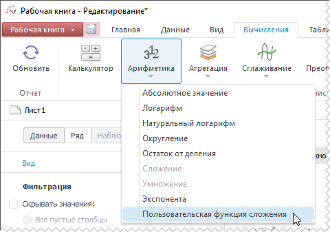 После применения пользовательской функции в рабочей книге будет создан вычисляемый ряд с наименованием вида «Наименование_пользовательской_функции(<Имя_Ряда>)», содержащий результаты расчета. Например: