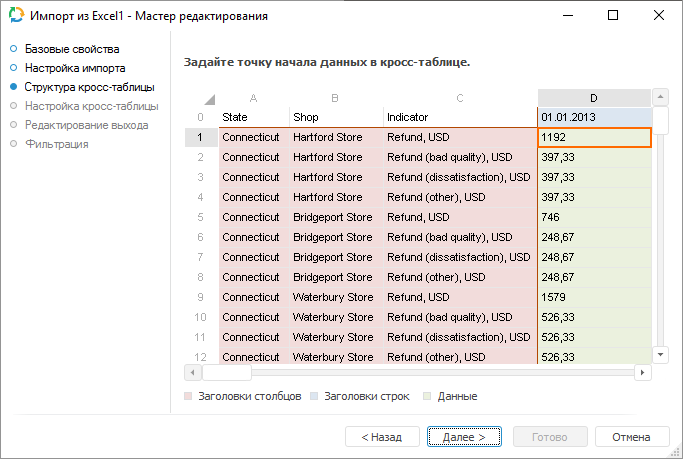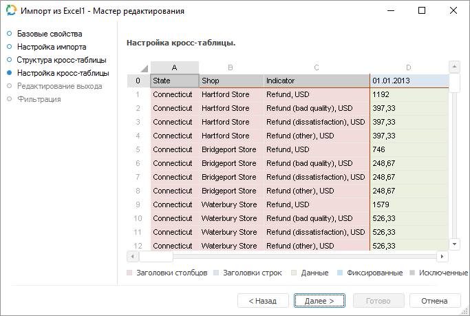 Цвет выделенных ячеек отражает тип данных. Зависимость типа данных от цвета ячеек указана в легенде. Белым цветом выделяются ячейки, которые будут исключены при настройке кросс-таблицы и импортированы не будут. Ячейки, которые были исключены, будут использованы как заголовки столбцов.